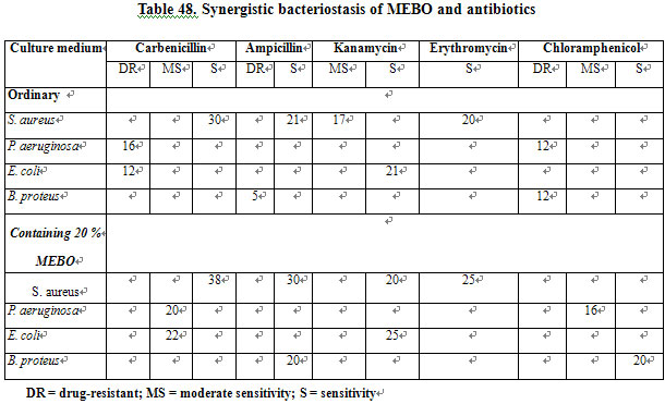 Synergistic Effect of MEBO and Antibiotics on Bacteriostasis. When cultured in medium containing 20 % MEBO, P. aeruginosa resistant to carbenicillin and chloromycetin became moderately sensitive and B. proteus resistant to chloromycetin and ampicillin became sensitive. Both carbenicillin and kanamycin had a synergistic effect with MEBO against E. coli. Carbenicillin, ampicillin, kanamycin and erythromycin had a synergistic effect with MEBO against S. aureus (Table 48).