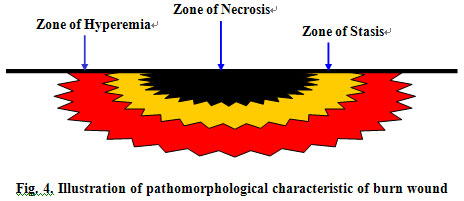 3. Reject Reaction of Necrotic Tissues: At 72 h postburn, the wound tissue comes into a phase of rejection reaction, which is a response of the viable tissues due to disintegration of necrotic tissues and cells in the interface of the lesion area. Usually mixed and extensive, this reaction process primarily includes three pathogeneses: (1) the disintegration of necrotic histiocytes in the injury interface; (2) the regeneration of viable histiocytes in the interface of the lesion area; (3) microbial infection in the injury interface. Besides an inflammatory reaction, disintegration of necrotic histiocytes may induce cell liquefaction in the injury interface and, more importantly, the accumulation of cell liquefied products continues the aggravation of the injured tissue. Meanwhile, the residual viable tissues in the injury interface begin instinctive regeneration when disintegrated tissues develop into a destructive substance unfavorable to the environment of cell regeneration, thereby inducing serious inflammation. The combination of the two above pathogeneses disturbs flora residing in the skin and causes the destruction of microbes in the injured area, both of which further aggravate damages and may result in systemic injury at any time. This process is called “rejection injury of necrotic tissues”, and is the last primary injury of a burn wound.