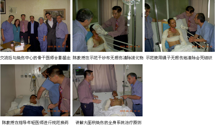 3、2010年6月10日上午,陳教授應(yīng)邀到約旦大學(xué)醫(yī)院(約旦最大的醫(yī)院,650病床)的燒傷中心(8張病床)進(jìn)行學(xué)術(shù)交流和指導(dǎo)。燒傷中心主任兼急診科主任Dr. Samir Jabaiti 教授熱情接待了陳教授一行,Dr. Samir教授首先帶領(lǐng)陳教授參觀考察了燒傷中心和急診科,并詳細(xì)介紹了燒傷再生醫(yī)學(xué)技術(shù)在醫(yī)院燒傷中心和急診科的應(yīng)用情況,在參觀急診科的過程中剛好有一個頭面部和雙上肢燒傷的急診患者,Dr. Samir指揮值班醫(yī)師馬上使用燒傷再生醫(yī)學(xué)技術(shù)和MEBO治療創(chuàng)面,患者接受治療后感到很滿意。隨后,陳教授應(yīng)邀到Dr. Samir的辦公室進(jìn)行了長達(dá)1個半小時的學(xué)術(shù)交流,陳教授細(xì)心地解答了該院在應(yīng)用再生醫(yī)學(xué)技術(shù)治療深度燒傷的問題、預(yù)防和控制感染的問題、大面積燒傷的抗休克問題、門診病人的家庭治療問題等。由于該院是醫(yī)科大學(xué)教學(xué)醫(yī)院,因此還重點討論了下階段的臨床科學(xué)研究的命題、設(shè)計和具體的計劃等。交流討論在非常熱烈、和諧的氛圍中進(jìn)行,Dr. Samir多次說到:“真是相見很晚!”,如果能夠早些見面,現(xiàn)在有很多的臨床研究工作都應(yīng)該出成果了。他希望雙方保持密切的聯(lián)系,共同醫(yī)治病人和合作完成臨床科研工作。