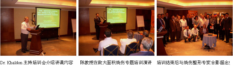 2.2010年6月9日晚上,約旦全國燒傷再生醫(yī)學(xué)培訓(xùn)與交流會在Iemeridien Hotel 的會議室召開,來自全國的22名燒傷整形醫(yī)師(全國總共有25名燒傷整形醫(yī)師)和1名來自鄰國巴勒斯坦的燒傷整形醫(yī)師參加了這次培訓(xùn)會議。培訓(xùn)會議由約旦燒傷整形外科學(xué)會的秘書、約旦軍隊醫(yī)療服務(wù)中心主任Dr. khaldon Hadadien 主持,陳教授以“Burns Regenerative Medicine and Therapy in Big Burn Treatment”(燒傷再生醫(yī)學(xué)與療法治療大面積燒傷)為題目,向各位燒傷整形外科專家介紹了燒傷再生醫(yī)學(xué)在深度燒傷皮膚原位再生機(jī)理、創(chuàng)面治療規(guī)范和全身系統(tǒng)治療原則等,陳教授在講解中結(jié)合自己的臨床實踐經(jīng)驗和體會,并以具體的臨床實際病例為教學(xué)案例深入淺出地講解,內(nèi)容豐富、新穎,通俗易懂,很受各位專家的歡迎。