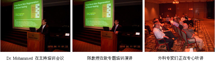 4、2010年6月11日晚上,約旦再生醫(yī)學(xué)外科醫(yī)師培訓(xùn)班在Sheraton Hotel的會議室召開,來自約旦首都各主要醫(yī)院的20多名普通外科、骨科和皮膚科專家參加了培訓(xùn)會。會議有約旦的國家經(jīng)理Dr. Mohammed Elayyan主持,陳教授應(yīng)邀以“From Burnt Skin Regeneration to Wound Healing”(從燒傷皮膚再生到創(chuàng)面愈合)為題,向參會的各位外科專家介紹了燒傷再生醫(yī)學(xué)的皮膚組織的再生機(jī)理和在各種嚴(yán)重的急性創(chuàng)傷和慢性可以的臨床治療經(jīng)驗和具體的臨床治療方法,大家聽后很受啟發(fā),受益匪淺,培訓(xùn)效果較理想。