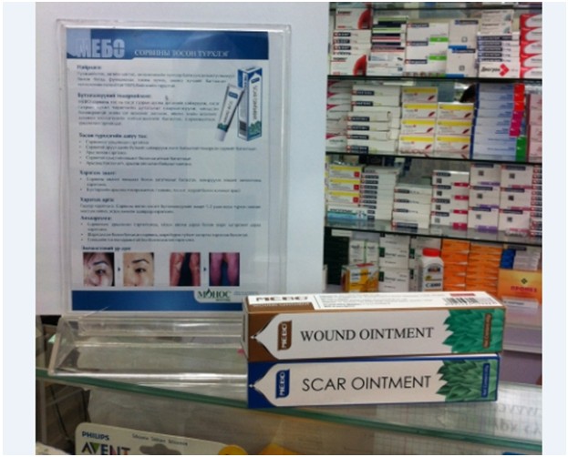 圖為美寶產(chǎn)品在一家叫Island的藥店,創(chuàng)傷膏銷量排名第二,僅次于多年前進(jìn)入蒙古市場(chǎng)的一款俄羅斯創(chuàng)傷產(chǎn)品,其價(jià)格是美寶產(chǎn)品的五分之一。