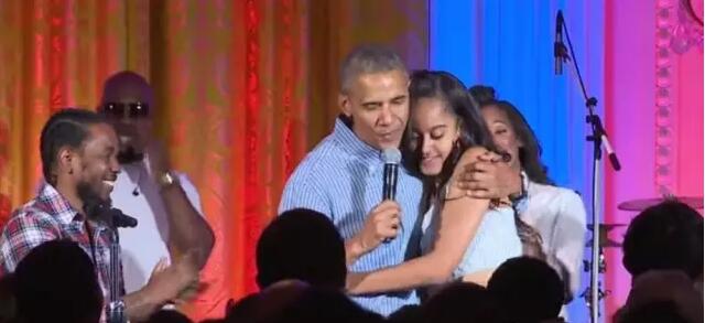 白宮國慶聚會一向在南草坪舉行,本來包括老兵及其家屬們在內的數(shù)千人將會參見在白宮南草坪的聚會,但是由于當天一直在下雨,白宮辦公室在聚會前一小時不得不臨時取消了室外的幾千人聚會,改成在白宮里面只有總統(tǒng)特邀貴賓兩百人可以出席的小型私人聚會,慶祝美國國慶的同時也為剛好同日生日的奧巴馬總統(tǒng)大女兒瑪利亞慶生,兩百貴賓與奧巴馬總統(tǒng)全家一起歡慶國慶及瑪利亞18歲生日,共同欣賞了美國著名流行歌星Kendrick Lamar 和 Janelle Monáe的精彩表演。隨后奧巴馬總統(tǒng)發(fā)表了國慶講話,并為瑪利亞唱起祝你生日快樂歌,將現(xiàn)場氣氛推向高潮。