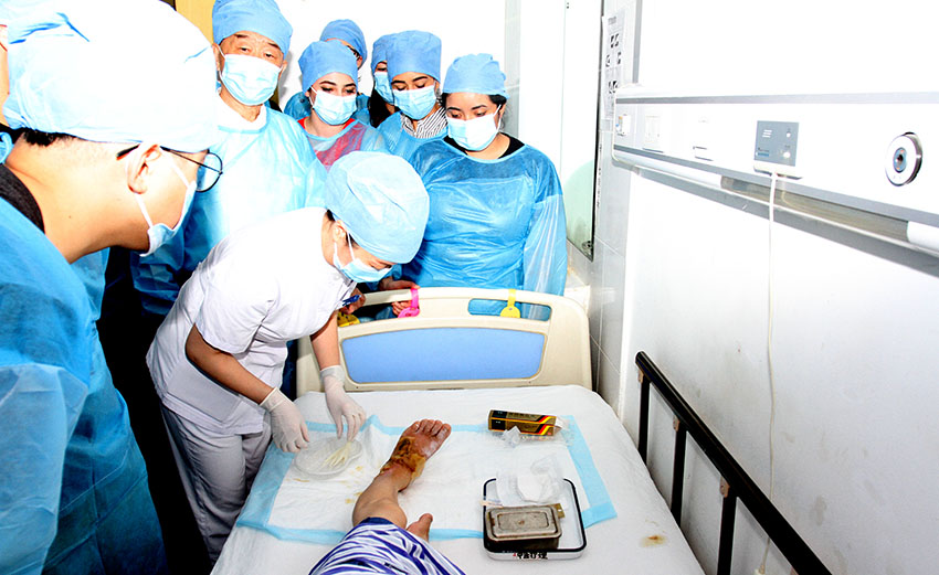 美國師生團一行在外科病房全程觀摩了醫(yī)護人員為燒傷和糖尿病足患者換藥的全過程。并由護士長手把手地為美國護理專業(yè)的學生傳授燒傷創(chuàng)瘍再生醫(yī)療技術規(guī)范換藥方法。
