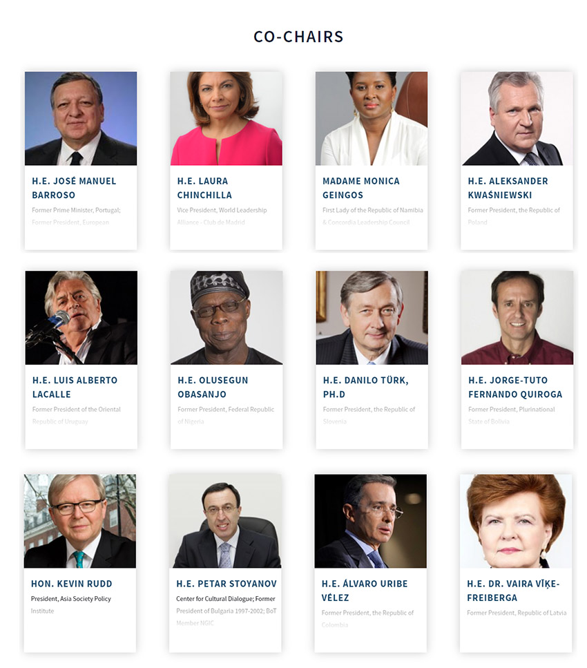 CONCORDIA擁有由前國家元首,行業(yè)領(lǐng)導人和政策專家組成的強大名冊,這些官員在政府和企業(yè)的各個層面都有實際經(jīng)驗,通過提供戰(zhàn)略指導,致力于積極促進跨界合作來創(chuàng)造可持續(xù)發(fā)展的繁榮未來,并產(chǎn)生國際影響。