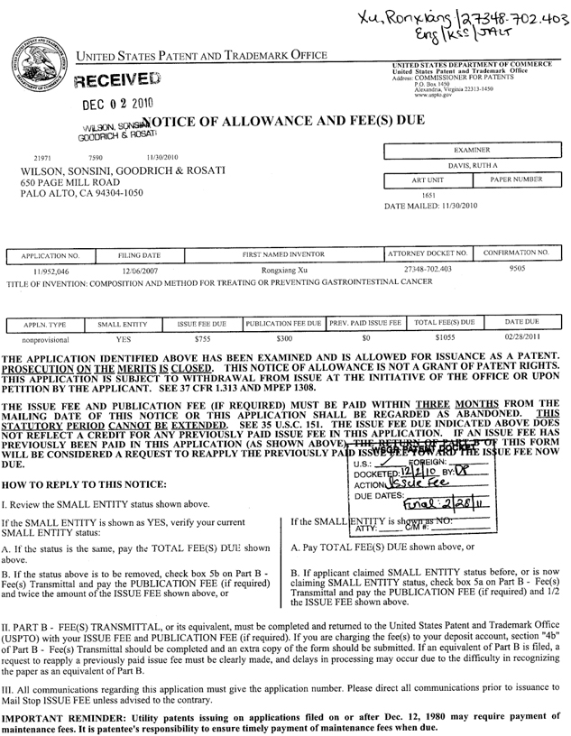 在辭舊迎新之際,集團(tuán)的喜事不斷,禮包不斷,近日,再接到從美國(guó)專利局傳來的振奮人心的喜訊,再生生命科學(xué)創(chuàng)始人徐榮祥教授的“治療與預(yù)防胃腸道癌癥方法”的專利已獲得正式授權(quán)。該專利是繼徐教授在獲得系列專利權(quán)之后,在人體再生復(fù)原科學(xué)研究和科學(xué)成果確認(rèn)的又一重大進(jìn)展與突破。至此,徐教授已獲得美國(guó)、日本、歐洲、加拿大等主要國(guó)家23項(xiàng)發(fā)明專利。再一次證實(shí)了在生命科學(xué)領(lǐng)域,話語權(quán)牢牢的掌握在美寶人手中,在知識(shí)產(chǎn)權(quán)發(fā)展過程中的具有重要意義“治療與預(yù)防胃腸道癌癥配方和方法”是美寶科研成果實(shí)際臨床應(yīng)用的重要成就,近年來,胃腸道癌癥的發(fā)病率居高不下,嚴(yán)重威脅著人類生命健康,傳統(tǒng)醫(yī)療手段效果不佳。該專利技術(shù)的問世,不啻是為人類健康帶來的天大福音。根據(jù)這一專利開發(fā)的技術(shù)和產(chǎn)品,可以利用人體的再生潛能,為解決人類胃腸提前衰老,治療和預(yù)防癌癥的發(fā)生,為目前醫(yī)學(xué)手段難以解決的胃腸道癌癥預(yù)防與治療提供了全新的解決辦法,以徐榮祥教授為核心的美寶科研團(tuán)隊(duì)在再生生命科學(xué)領(lǐng)域里所取得的這一前沿臨床應(yīng)用成果,為人類再生生命科學(xué)發(fā)展道路上具有新的里程碑式的意義。