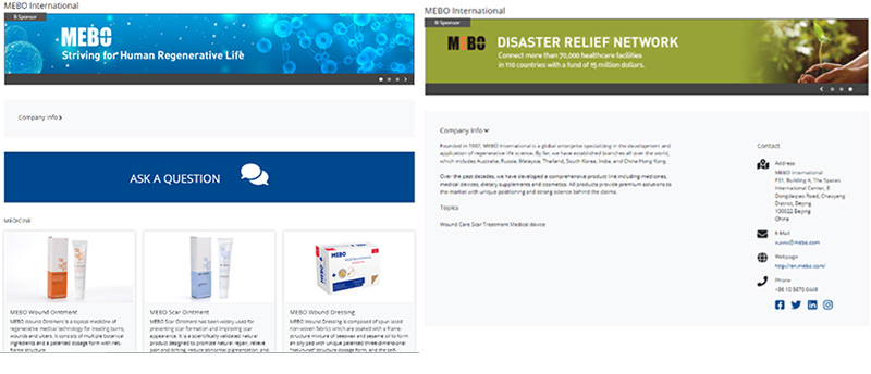 美寶國際精心設(shè)計(jì)的在線展臺(tái),力求從多方面向與會(huì)者展示企業(yè)風(fēng)采。在產(chǎn)品方面,不僅展示了濕潤(rùn)燒傷膏、疤痕軟膏等已在全球應(yīng)用數(shù)十年的核心產(chǎn)品,還重點(diǎn)介紹了近期在美國成功注冊(cè)的創(chuàng)瘍帖。同時(shí),在展臺(tái)醒目的位置上,特別呈現(xiàn)了近日我們?cè)诼?lián)合國75周年峰會(huì)上提出的全球倡議——與全球110個(gè)國家7萬多家醫(yī)療機(jī)構(gòu)合作,建立全球?yàn)?zāi)難與救援網(wǎng)絡(luò)。