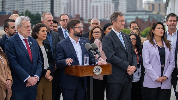 智利總統(tǒng)加夫列爾·博里奇在灣區(qū)委員會克拉馬斯號頂層“美寶花園”發(fā)表演講