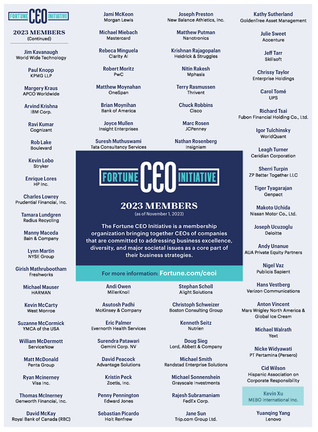 2023年12月,《財富》雜志跨年期刊公布了財富CEO倡議2023年名單,美寶集團董事局主席、APEC籌委會主席徐鵬再度入列該名單,這是財富CEO倡議于2017年發(fā)起以來,徐鵬第四次入列該名單。《財富》首席執(zhí)行官倡議是會員制組織,它致力于將解決卓越業(yè)務(wù)、多樣性和重大社會問題的頂級首席執(zhí)行官聚集在一起,期待通過精英CEO、學(xué)者和慈善家們合作為世界多重問題提供解決策略來促進世界繁榮,并將其力量作為業(yè)務(wù)戰(zhàn)略的核心部分。