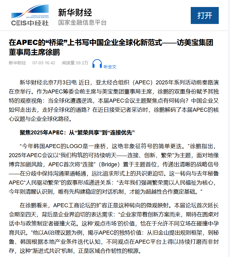 新華財(cái)經(jīng):在APEC“橋梁”上書(shū)寫中國(guó)企業(yè)全球化新范式—訪美寶集團(tuán)董事局主席徐鵬