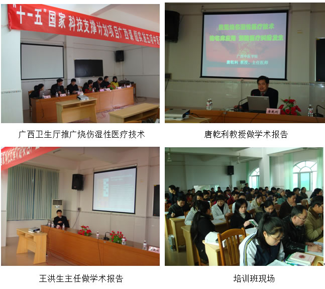 當(dāng)日上午9:30分,開幕式結(jié)束后,適宜技術(shù)培訓(xùn)班正式開始,王洪生研究員應(yīng)邀首先以“燒傷濕性醫(yī)療技術(shù)臨床規(guī)范化應(yīng)用和再生療法在難治性創(chuàng)瘍治療新進展”進行了專題臨床學(xué)術(shù)講座;接下來,中國中西醫(yī)結(jié)合學(xué)會燒傷專委會副主任委員、廣西中西醫(yī)結(jié)合學(xué)會燒傷分會主委、廣西中醫(yī)學(xué)院科技處處長、“十一五”國家科技支撐計劃項目燒傷濕性醫(yī)療技術(shù)臨床規(guī)范化應(yīng)用等5項適宜技術(shù)課題負責(zé)人唐乾利教授,做了“規(guī)范燒傷濕性醫(yī)療技術(shù)的臨床應(yīng)用,預(yù)防醫(yī)療糾紛發(fā)生”的專題講座。燒傷濕性醫(yī)療技術(shù)研究方向的碩士研究生趙乙飛、任文東等對金秀縣人民醫(yī)院桐木分院、金秀縣瑤醫(yī)院的燒傷、創(chuàng)瘍病人進行了現(xiàn)場技術(shù)指導(dǎo)。