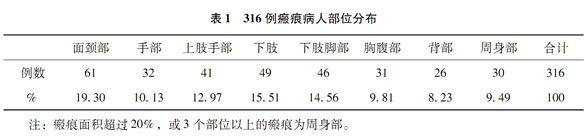 本組316例病人均按我們以往設計的療程,療效評定標準進行療效評定。良好:無增生性瘢痕出現(xiàn),創(chuàng)面皮膚彈性正常,色澤早期稍變喑,后期恢復正常,或稍蒼白。尚好:預防性用藥中逐漸出現(xiàn)增正性瘢痕,主要指淺Ⅲ度以上的燒傷創(chuàng)面,經繼續(xù)治療性用藥瘢痕消退或明顯縮小不需手術整形者。有效:部分瘢痕消退,但遺留在顏面、四肢關節(jié)部位的瘢痕,由于美觀、功能需要仍需配合手術整形者。無效:經半年預防性用藥,和中后期治療性用藥合計在8個月以上,瘢痕色澤變喑,仍表現(xiàn)質硬、增牛明顯、瘙癢。患者迫切要求手術整形者。根據(jù)以上標準,本組316例病人,全部在有效范圍,有效率100%,見表2