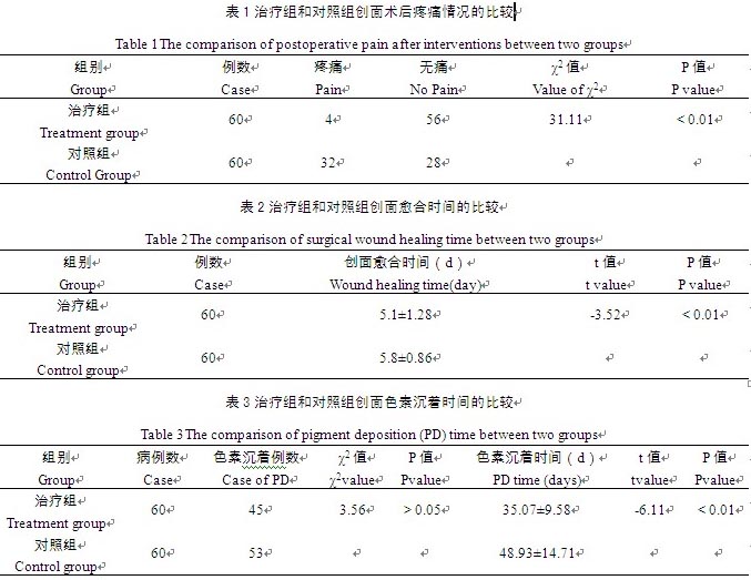 采用常規(guī)碘酒、酒精消毒創(chuàng)面,術(shù)區(qū)局部用0.5%利多卡因生理鹽水溶液浸潤(rùn)麻醉,然后用雙波長(zhǎng)脈沖調(diào)Q激光(長(zhǎng)春光機(jī)所生產(chǎn)的YQ400-A/BI)進(jìn)行治療,激光臨床參數(shù)的設(shè)定依據(jù)病變調(diào)整,激光的波長(zhǎng)、能量密度、光斑、脈寬和頻率應(yīng)根據(jù)患者的年齡、膚色、病變部位、病變顏色進(jìn)行設(shè)定;本激光有532 nm和1064 nm兩個(gè)波長(zhǎng)。激光治療完畢后,按照皮膚原位再生醫(yī)療技術(shù)進(jìn)行創(chuàng)面處理:不使用刺激性消毒液,用無(wú)菌生理鹽水清洗干凈。然后治療組采用美寶濕潤(rùn)燒傷膏外涂,可用壓舌板或棉簽將其均勻涂抹于創(chuàng)面,厚1 mm~2 mm,4 h~6 h換藥1次,每次涂藥前將創(chuàng)面殘留的藥物和滲出物清除干凈,可先用無(wú)菌生理鹽水清洗創(chuàng)面,然后涂美寶濕潤(rùn)燒傷膏,應(yīng)時(shí)刻保持創(chuàng)面呈濕潤(rùn)狀態(tài),防止創(chuàng)面結(jié)痂,直至創(chuàng)面愈合。對(duì)照組采用1%紅霉素軟膏外涂(涂藥厚度、換藥時(shí)間、創(chuàng)面清洗等和治療組相同),直至創(chuàng)面愈合。兩組均觀察記錄創(chuàng)面愈合時(shí)間、術(shù)后疼痛情況,并隨訪6個(gè)月至9個(gè)月,觀察創(chuàng)面色素沉著情況。創(chuàng)面愈合后叮囑患者注意防曬,以避免色素沉著,同時(shí)服用維生素c減輕色素沉著。