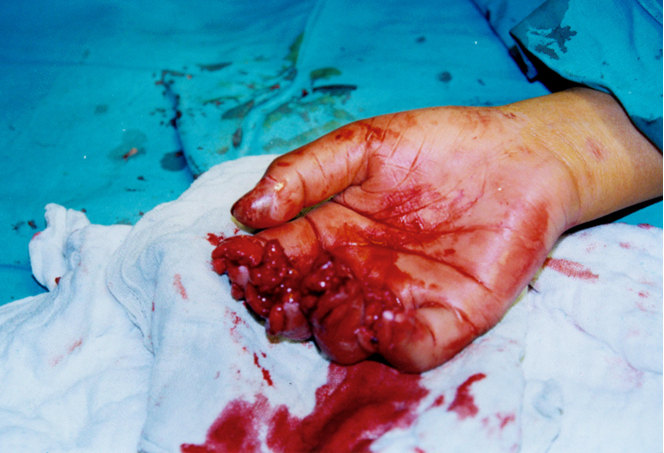 損傷原因:均為魚粉廠工人用粉碎機粉碎魚粉過程中不慎手指進入而引起手指粉碎、絞傷。共損傷手指23指其中拇指3例、食指6例、中指6例、無名指4例、小指4例,損傷程度:損傷手指中末節(jié)不同程度完全粉碎缺失或近似完全缺失。手指掌指關節(jié)及中節(jié)皮膚肌腱、血管、神經均不同程度絞傷、撕脫呈條索狀、3指掌指關節(jié)近端有撕脫骨折。接診時間均在傷后3小時入