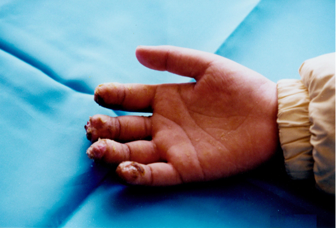 患者,劉xx,女,26歲,工人,重慶人,因粉碎魚粉過程中,右手不慎進入機器內,至右手粉碎傷1.5小時,急診入院于2008年7月,住院號383586。入院查體:右手示、中、環(huán)、小指中末節(jié)不同程度缺失,組織損毀嚴重。該患者損傷嚴重,入院后及時給與心理疏導,幫助建立康復信心,采用保留清創(chuàng)后,手指損傷局部應用MEBT/MEBO創(chuàng)面治療,術后創(chuàng)面應用紅外線照射,病人住院15天后康復出院,出院后繼續(xù)外涂MEBT/MEBO治療,半年后隨訪,損傷的手指局部組織再生,恢復一定長度,痛溫覺及相應功能健在。