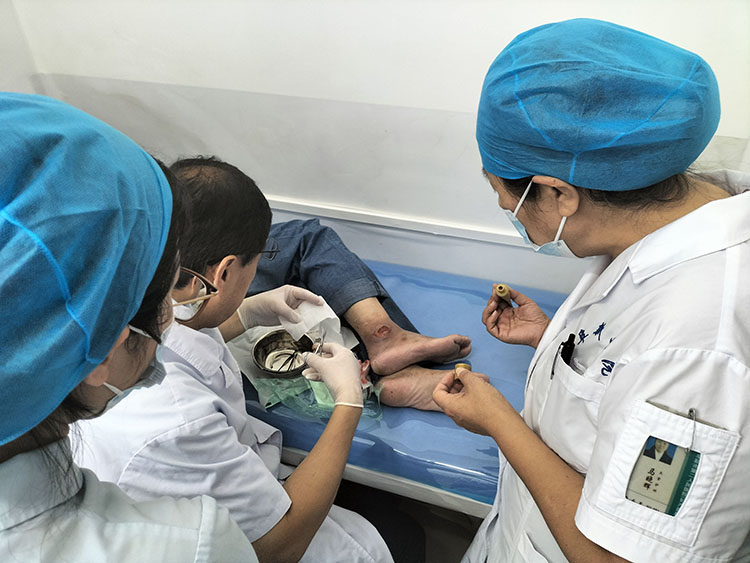 2023年7月17日,《中國(guó)燒傷創(chuàng)瘍雜志》編委、燒傷創(chuàng)瘍?cè)偕t(yī)療技術(shù)臨床專(zhuān)家張強(qiáng),應(yīng)邀走訪(fǎng)湖北宜昌白洋鎮(zhèn)滾鐘坡村衛(wèi)生室,枝江市人民醫(yī)院甲乳燒傷科及枝江市中醫(yī)醫(yī)院醫(yī)養(yǎng)結(jié)合科,共會(huì)診二例慢創(chuàng)患者及一例燒傷患者。通過(guò)與醫(yī)護(hù)人員交流,張主任強(qiáng)調(diào)規(guī)范換藥細(xì)節(jié)及重要性,大家也發(fā)現(xiàn)差異性,對(duì)張主任提供的個(gè)性化治療方案予以認(rèn)可。此行會(huì)診交流得到醫(yī)護(hù)人員高度贊賞!