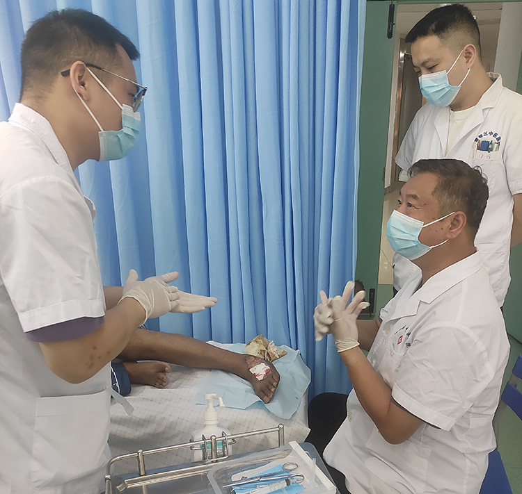 2024年9月22日, 應(yīng)黃江區(qū)中醫(yī)院外科葉峰主任邀請,《中國燒傷創(chuàng)瘍雜志》編委、燒傷創(chuàng)瘍再生醫(yī)療技術(shù)臨床專家張強(qiáng)來到該院會診,對一例腳部筋骨外露的透析患者現(xiàn)場示范換藥,講解換藥細(xì)節(jié),后與科室醫(yī)生就臨床中遇到的慢性創(chuàng)面的處理做了交流,此次活動(dòng)極大增進(jìn)了大家對再生醫(yī)療技術(shù)的了解,增強(qiáng)了運(yùn)用技術(shù)治療慢性創(chuàng)面的信心!