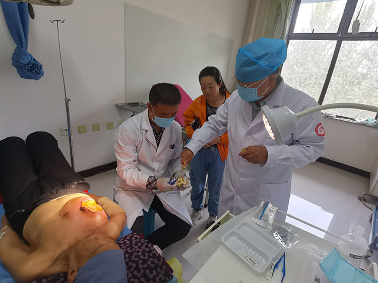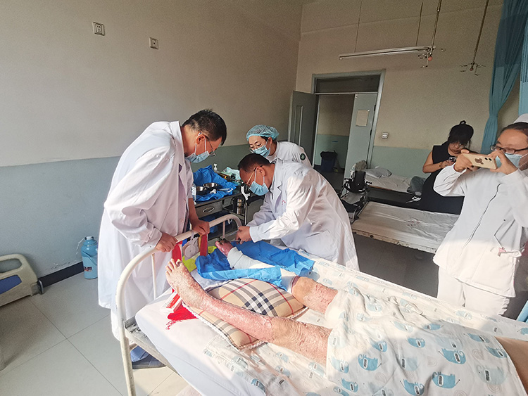 9月27日,應(yīng)大同市云岡區(qū)人民醫(yī)院邀請,《中國燒傷創(chuàng)瘍雜志》常務(wù)編委、燒傷創(chuàng)瘍再生醫(yī)療技術(shù)臨床專家趙瑞慶教授在該院進(jìn)行臨床教學(xué)查房,共檢視了7例慢瘡患者(糖尿病潰瘍3一5級5例,頸后巨大癰1例,燒傷多部位合并癥、骨外露、會陰部粘連、左肘關(guān)節(jié)粘連、右足多趾干性壞死1例),并在事后對每一位患者制定了進(jìn)一步治療方案。