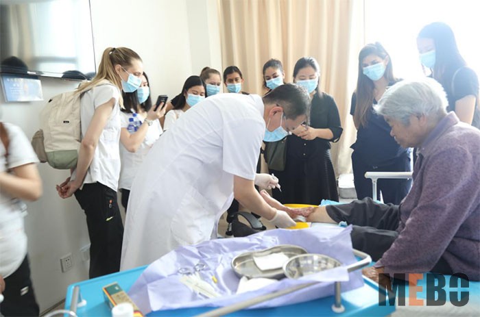 接著師生一行參觀了病房,醫(yī)生為學(xué)生們示范并講解了美寶濕潤(rùn)燒傷膏的用藥規(guī)范和治療創(chuàng)面的方法。
