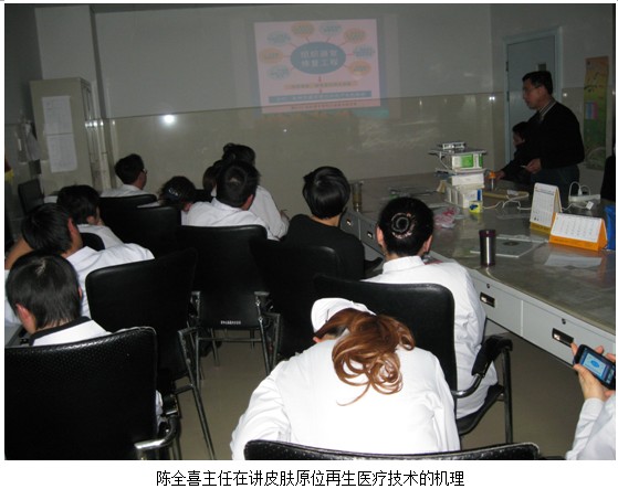 2012年12月10日下午兩點(diǎn),中國(guó)中西醫(yī)結(jié)合學(xué)會(huì)燒傷專業(yè)委員、北京美寶燒傷創(chuàng)瘍研究所臨床部副主任醫(yī)師陳全喜應(yīng)邀來(lái)到信陽(yáng)市中醫(yī)院與燒傷科、外科、婦科、內(nèi)分泌科的醫(yī)師進(jìn)行皮膚原位再生醫(yī)療技術(shù)的培訓(xùn)。