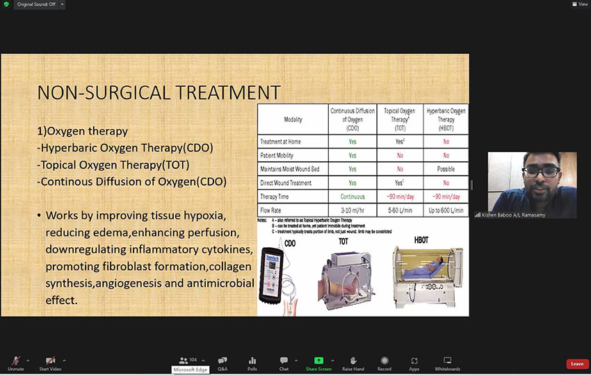 隨后,來自馬來西亞Tengku Ampuan Rahimah Klang醫(yī)院創(chuàng)面科、骨科的Dr. Kishen Baboo Ramasamy帶來了題為《糖尿病足治療》的演講。他結(jié)合系統(tǒng)治療及局部創(chuàng)面治療,全面地講解了糖尿病足的治療方法。