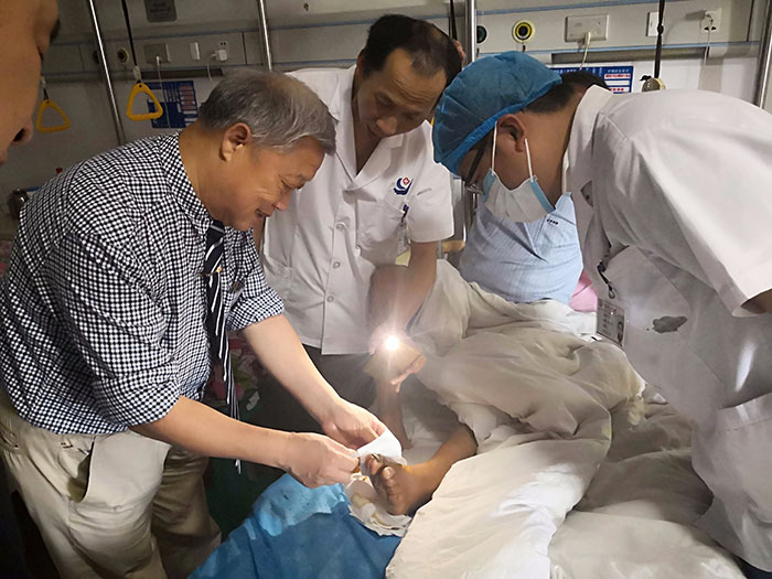 培訓(xùn)現(xiàn)場(chǎng)反響強(qiáng)烈,大家表示本次授課實(shí)實(shí)在在解決了臨床中難愈合創(chuàng)面的換藥難題。會(huì)后會(huì)診了兩例難愈合創(chuàng)面患者,一個(gè)是右踝關(guān)節(jié)離斷再植、關(guān)節(jié)創(chuàng)面難愈合,一個(gè)是左踝關(guān)節(jié)外傷感染難愈合。金教授現(xiàn)場(chǎng)給予技術(shù)指導(dǎo),傳授了再生醫(yī)療技術(shù)的臨床治療規(guī)范,實(shí)實(shí)在在解決了難愈合創(chuàng)面的換藥難題。
