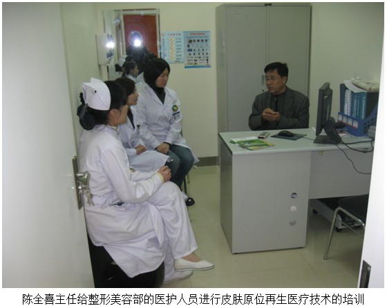 2012年11月5日,中國(guó)中西醫(yī)結(jié)合學(xué)會(huì)燒傷專業(yè)委員會(huì)委員、北京美寶燒傷研究所臨床部專家陳全喜主任應(yīng)邀來(lái)到鄭州大學(xué)第二附屬醫(yī)院醫(yī)學(xué)整形美容科,對(duì)醫(yī)學(xué)整形美容科的醫(yī)護(hù)人員進(jìn)行皮膚原位再生醫(yī)療技術(shù)的專業(yè)培訓(xùn)。