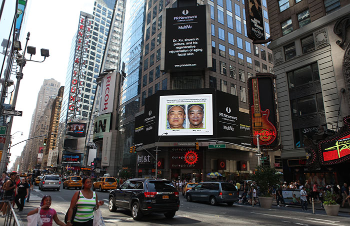 路透社再次在紐約時代廣場大屏幕報道人體器官再生技術(shù)發(fā)明人徐榮祥的新聞,并配發(fā)徐榮祥本人再生還童的照片。