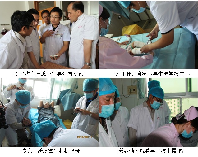 除了觀摩再生醫(yī)學(xué)技術(shù)學(xué)習(xí)和實(shí)際操作,另外,美寶國(guó)際技術(shù)總部與劉主任在科室共同舉辦了中外專家 再生醫(yī)學(xué)討論會(huì)議,中外醫(yī)生分別作了大量關(guān)于大面積深度重度燒傷病人、難愈性糖尿病足創(chuàng)面愈合病人應(yīng)用美寶再生醫(yī)學(xué)技術(shù)治療的演示,包括再生治療前后顯著優(yōu)越于傳統(tǒng)醫(yī)學(xué)治療前后的典型圖片,并全程播放了美寶首席專家王洪生教授微粒皮種植手術(shù)視頻,大面積燒傷患者治療視頻,會(huì)議后外國(guó)專家們同時(shí)針對(duì)多個(gè)傳統(tǒng)醫(yī)學(xué)治療難題與劉平洪主任展開熱烈討論,外國(guó)專家們紛紛震驚于美寶再生醫(yī)學(xué)技術(shù)所取的卓越的臨床治療效果,并表示回國(guó)要開始將美寶再生醫(yī)學(xué)技術(shù)應(yīng)用于病人,會(huì)議氣氛熱烈,將此次廣州培訓(xùn)活動(dòng)推向一個(gè)高潮。