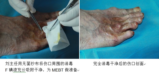 1部分:查房 9.17 日早上,9點(diǎn)準(zhǔn)時(shí),作完雙方醫(yī)生自我介紹之后,美寶國(guó)際集團(tuán)技術(shù)總部吳曉偉醫(yī)生帶著3國(guó)醫(yī)生在劉平洪主任的帶領(lǐng)下,開始病房查房,首先第1個(gè)病人是1位60歲糖尿病足潰瘍伴支氣管擴(kuò)張感染的老年男子 ,目前我們看到他右下足的傷口,是已經(jīng)經(jīng)過(guò)3周的美寶再生技術(shù)治療后,傷口快要痊愈的情景。