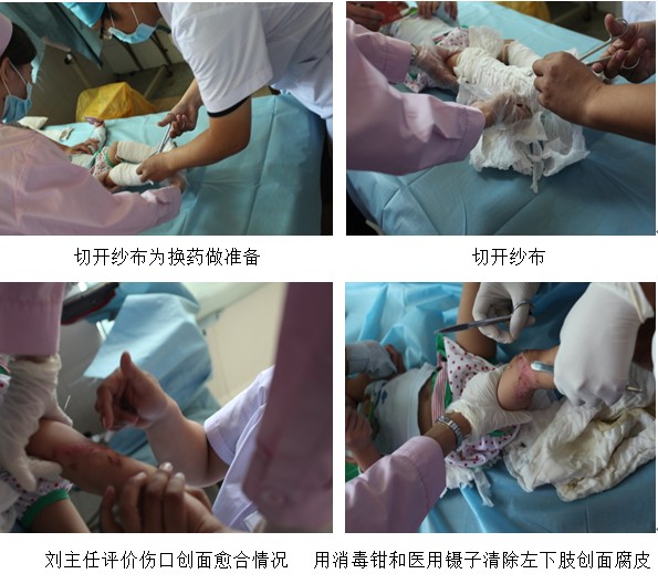 接下來(lái)我們看到的病人,是1個(gè)5個(gè)月大的小嬰兒,遇到沸水不幸,雙下肢燙傷其中左下肢較嚴(yán)重。