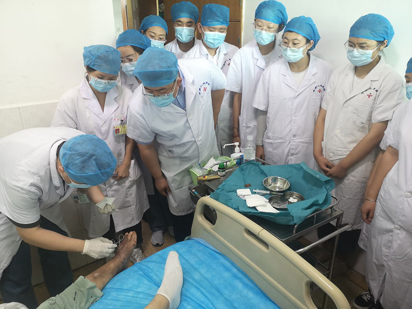 第二天大家繼續(xù)前往達(dá)郫都區(qū)人民醫(yī)院進(jìn)行了交流與學(xué)習(xí),享受?chē)?guó)務(wù)院特殊津貼專(zhuān)家、成都市郫都區(qū)人民醫(yī)院燒傷創(chuàng)瘍科學(xué)術(shù)帶頭人付子俊教授帶領(lǐng)大家查房并對(duì)病人案例一一分析講解;科室主任也特別給濱醫(yī)學(xué)子講述了大面積燒傷和深度潰瘍的治療等。