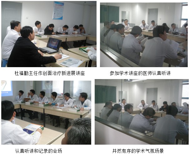 2012年10月24日下午14:30分中國中西醫(yī)結(jié)合學(xué)會(huì)燒傷專業(yè)委員會(huì)委員、北京美寶燒傷創(chuàng)瘍研究所臨床部杜福勤主任和學(xué)會(huì)駐安徽辦事處吳崇魏同志應(yīng)皖北總醫(yī)院燒傷整形科齊國軒主任的邀請,為該院燒傷整形科、腦外科、骨科、泌尿外科、內(nèi)分泌科舉辦《中西醫(yī)結(jié)合創(chuàng)面治療新進(jìn)展》學(xué)術(shù)講座。參加講座學(xué)習(xí)的30余人認(rèn)真聽取了杜福勤主任圖文并茂、通俗易懂的演講,會(huì)后解答了臨床遇到的實(shí)際問題,講座進(jìn)行了二個(gè)多小時(shí),受到與會(huì)者的歡迎和好評。