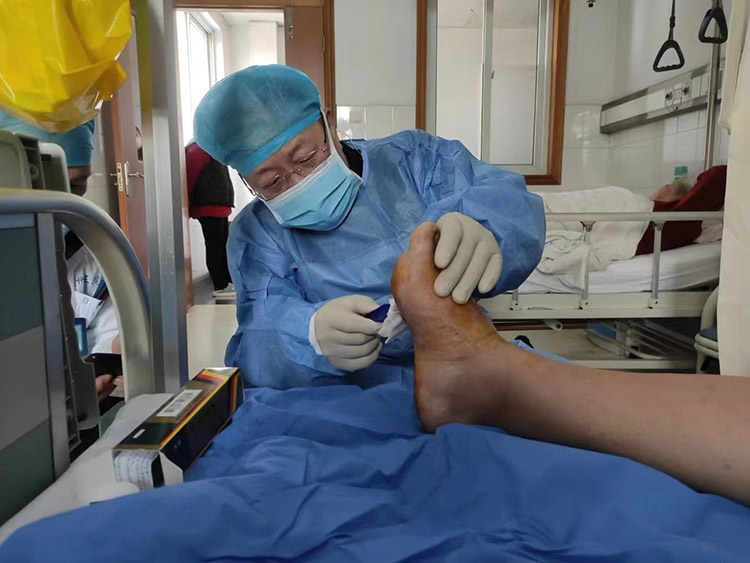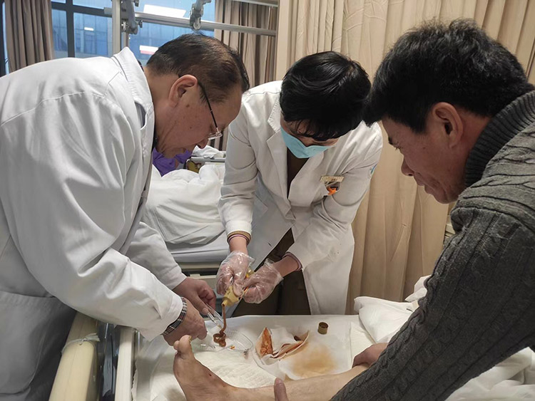 1月29日,《中國(guó)燒傷創(chuàng)瘍雜志》常務(wù)編委、燒傷創(chuàng)瘍?cè)偕t(yī)療技術(shù)臨床專家趙瑞慶教授,應(yīng)通州區(qū)第三人民醫(yī)院的再次邀請(qǐng),運(yùn)用再生醫(yī)療技術(shù)分別會(huì)診了四級(jí)糖尿病足潰瘍患者和長(zhǎng)期服用抗凝藥物,摔傷后致右下肢脛前皮膚破潰感染的患者。事后與當(dāng)?shù)蒯t(yī)務(wù)人員詳細(xì)制定進(jìn)一步治療計(jì)劃,糖足潰瘍患者聽到右足能夠保住的喜訊,流下了感激的淚水。