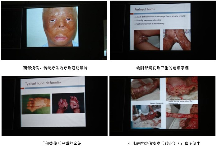 1月25日上午8點(diǎn)30分,會議正式開幕。第一天,印度燒傷學(xué)會安排了全天的印度國內(nèi)繼續(xù)教育(CME)項(xiàng)目培訓(xùn),上午是口頭演講,下午是視頻手術(shù)演示,18位來自印度各大燒傷中心的主任或者學(xué)術(shù)帶頭人就燒傷中使用傳統(tǒng)外科技術(shù)方法在創(chuàng)面及系統(tǒng)治療中進(jìn)行了介紹。面對印度燒傷界專家在講臺上展示他們“成功”的案例時,我們心中卻百感交集:本不富裕的印度人民和政府卻要為傳統(tǒng)外科技術(shù)治療燒傷過程中各種手術(shù)及手術(shù)后遺癥治療時高昂的費(fèi)用買單,同時燒傷病人還不得不承受創(chuàng)面恢復(fù)及身體康復(fù)過程中的痛苦;面對醫(yī)療資源的匱乏,甚至在燒傷止疼上,連最起碼地為病人減少疼痛的概念,還需要培訓(xùn)專家反復(fù)呼吁參會印度醫(yī)生引起注意;一張張面目全非的臉,一幅幅嚴(yán)重攣縮瘢痕的照片,一幀幀血肉模糊的影像讓我們更加堅(jiān)信高性價比的再生醫(yī)療技術(shù)非常適合印度國情,再生醫(yī)療技術(shù)在印度全面地發(fā)展指日可待。