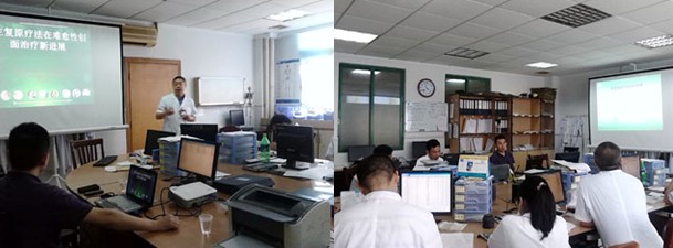 會(huì)議在下午3:00分在該科教研室兼辦公室舉行,黃武全主任主持學(xué)術(shù)會(huì)議,戴衛(wèi)平副院長(zhǎng)參加了會(huì)議,該科普外科、肛腸科、骨科、燒傷外科學(xué)組醫(yī)護(hù)人員認(rèn)真聆聽了此次培訓(xùn)。王主任的專題學(xué)術(shù)報(bào)告分為三部分,在第一部分概述中,王主任重點(diǎn)講述了我國(guó)著名生命科學(xué)家、醫(yī)學(xué)家徐榮祥教授近年來在人體再生復(fù)原科學(xué)研究領(lǐng)域所取得的重大臨床及實(shí)驗(yàn)研究成果,2012年分別發(fā)表在《英國(guó)外科雜志》和《國(guó)際燒傷雜志》2篇綜述中有關(guān)磺胺嘧啶銀及含銀敷料等外用銀制劑用于急性創(chuàng)傷和燒傷創(chuàng)面會(huì)造成創(chuàng)面愈合延遲、增加疼痛和感染率的最新觀點(diǎn),以及再生復(fù)原療法的概念及其解決難愈性創(chuàng)面治療的機(jī)理;第二部分重點(diǎn)介紹了再生復(fù)原療法創(chuàng)面規(guī)范的處理方法;第三部分重點(diǎn)講述了再生復(fù)原療法在各類難愈性創(chuàng)瘍創(chuàng)面治療要點(diǎn)及典型病例介紹,并結(jié)合大量的病例圖片講解了各類深度燒傷創(chuàng)面、再生醫(yī)療技術(shù)在骨外露、鋼板外露、糖尿病足、動(dòng)脈閉塞癥、撕脫傷、斷肢再生、手術(shù)切口感染、褥瘡等各種難愈合創(chuàng)面的治療過程及要點(diǎn)。會(huì)議持續(xù)到近6點(diǎn)才結(jié)束。戴院長(zhǎng)代表醫(yī)院對(duì)王主任的到來表示感謝,并表示受益匪淺,王主任的講座進(jìn)一步加深了該院對(duì)原位再生技術(shù)的認(rèn)識(shí),他們表示將在臨床中更加規(guī)范的使用該項(xiàng)技術(shù),為患者造福!