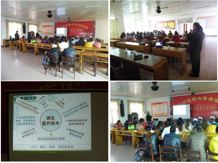 金黨軍教授針對(duì)醫(yī)院的情況,重點(diǎn)圍繞慢性皮膚潰瘍的治療技術(shù),從濕性燒傷治療技術(shù)開始講解燒燙傷創(chuàng)面的換藥原則和方法,并提醒大家,燒燙傷創(chuàng)面換藥的方法貫穿所有慢性皮膚潰瘍,如壓瘡、糖尿病足、脈管炎引起的皮膚潰瘍等等常見創(chuàng)面;金黨軍教授還講述了清理創(chuàng)面遵循的三個(gè)原則,并結(jié)合實(shí)例臨床圖片,詳細(xì)講解了美寶再生醫(yī)療技術(shù)的理論和實(shí)踐。整個(gè)培訓(xùn)班進(jìn)行了兩個(gè)小時(shí),醫(yī)生們都表示收獲很多,對(duì)美寶再生醫(yī)療技術(shù)有了初步認(rèn)識(shí)。住院部一樓的付護(hù)士長還專門請(qǐng)金老師到科室會(huì)診一位褥瘡患者,金老師會(huì)診后提出了治療方案,并結(jié)合剛剛課堂上講的方法,給病房護(hù)理人員講解再生技術(shù)臨床實(shí)踐的注意事項(xiàng)等。