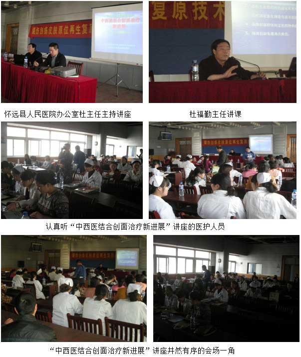 2012年10月21日至24日中國(guó)中西醫(yī)結(jié)合學(xué)會(huì)燒傷專業(yè)委員會(huì)委員、北京美寶燒傷創(chuàng)瘍研究所臨床部主任杜福勤和學(xué)會(huì)駐安徽辦事處張勇同志應(yīng)懷遠(yuǎn)縣人民醫(yī)院辦公室杜主任的邀請(qǐng),23日下午15:00為懷遠(yuǎn)縣人民醫(yī)院外科、內(nèi)科、婦產(chǎn)科、骨科、內(nèi)二科、五官科等科室及中醫(yī)院舉辦了“中西醫(yī)結(jié)合創(chuàng)面治療新進(jìn)展”講座,講座由醫(yī)院辦公室杜主任主持,60余名醫(yī)護(hù)人員參加了講座學(xué)習(xí),杜福勤主任結(jié)合臨床實(shí)踐圖文并茂的介紹了再生醫(yī)療技術(shù)的創(chuàng)立、理論基礎(chǔ)研究、臨床實(shí)踐以及國(guó)內(nèi)外的臨床實(shí)踐研究和臨床發(fā)展。介紹了2012年5月江蘇南通國(guó)際學(xué)術(shù)會(huì)議成功召開的情況。下午五點(diǎn),進(jìn)行了二個(gè)多小時(shí)的講座在多次熱烈掌聲中結(jié)束。會(huì)議介紹后,杜福勤主任應(yīng)衛(wèi)生局一位領(lǐng)導(dǎo)邀請(qǐng)為一名膽囊手術(shù)刀口不愈合患者會(huì)診,介紹應(yīng)用MEBO創(chuàng)瘍貼換藥治療刀口難愈創(chuàng)面的方法和技巧,受到患者及家屬的歡迎。