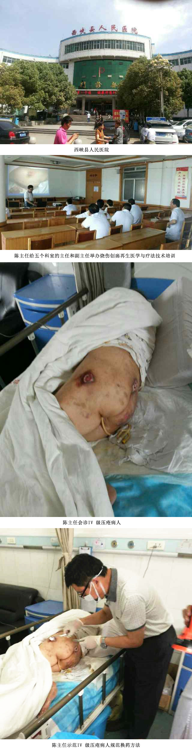 2014年5月29日,中國(guó)中西醫(yī)結(jié)合學(xué)會(huì)燒傷專業(yè)委員會(huì)常委、北京燒傷創(chuàng)瘍研究所陳全喜主任應(yīng)河南省西峽縣人民醫(yī)院的邀請(qǐng),給骨科、燒傷科、急診科、內(nèi)分泌科、皮膚科主任給五個(gè)科室的主任和副主任舉辦燒傷創(chuàng)瘍?cè)偕t(yī)學(xué)與療法技術(shù)培訓(xùn)。