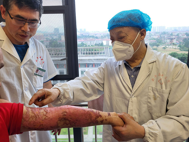 5月12日,中國中西醫(yī)結(jié)合學(xué)會燒傷專業(yè)委員會醫(yī)療部張強(qiáng)主任,受邀到訪武漢大學(xué)人民醫(yī)院經(jīng)開醫(yī)院中醫(yī)瘡瘍科會診壓瘡、下肢靜脈曲張血管性潰瘍、低溫燙傷等慢創(chuàng)患者,張主任示范了再生醫(yī)療技術(shù)規(guī)范清創(chuàng)、換藥及處理創(chuàng)面的技巧與細(xì)節(jié),會后同科室張成主任探討了患者的基礎(chǔ)病的治療與營養(yǎng)方案,針對不同的病情制定個(gè)性化治療方案。此次會診交流活動,促進(jìn)了中醫(yī)藥傳承創(chuàng)新,提升了中醫(yī)藥在治療瘡瘍科疾病中的作用!