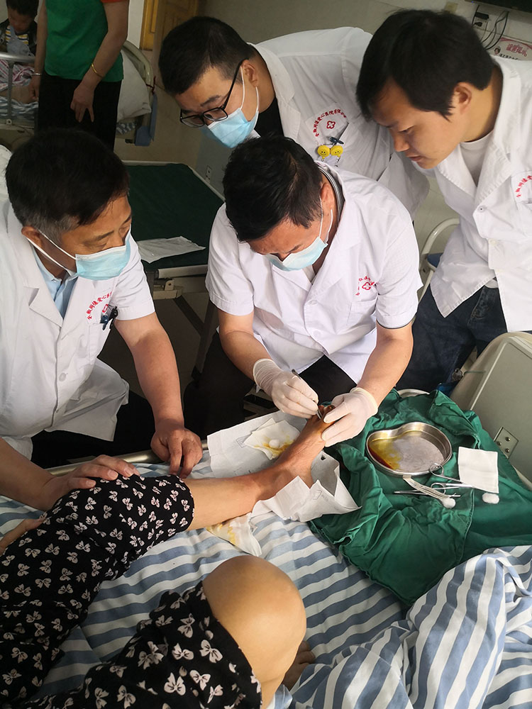 2023年5月19日,中國中西醫(yī)結(jié)合學(xué)會燒傷專業(yè)委員會醫(yī)療部張主任應(yīng)邀前往全椒縣同德愛心醫(yī)院,會診一例糖尿病足患者和一例褥瘡患者,張主任親自對創(chuàng)面進(jìn)行清創(chuàng),講解應(yīng)用再生醫(yī)療技術(shù)處理創(chuàng)面及換藥方法。會診結(jié)束后和醫(yī)生進(jìn)行了病情分析及治療方案的制定。