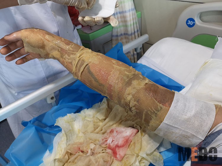9月24日,應湘陰縣人民醫(yī)院創(chuàng)口科室邀請,北京榮祥再生醫(yī)學研究所副所長、《中國燒傷創(chuàng)瘍雜志》編委金黨軍來到醫(yī)院會診燒傷患者,規(guī)范再生醫(yī)療技術換藥方法??剖依枳o士長陪同會診換藥。相比傳統(tǒng)療法,再生醫(yī)療技術在濕潤環(huán)境下進行原位修復再生,痛苦小,愈后少疤痕甚至無疤痕,大大提高了燒傷患者的生活質量。