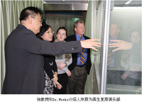 隨后,在徐教授的親自陪同下,來訪客戶參觀了人體原為再生復(fù)原俱樂部會所。徐教授向客人介紹了會所作為人體原為再生復(fù)原科學(xué)主要研究基地之一,近年來的建設(shè)成果以及未來世界范圍內(nèi)的發(fā)展規(guī)劃。會所世界上獨(dú)霸的技術(shù)、獨(dú)特的風(fēng)格、高檔的設(shè)施以及專業(yè)的技術(shù)實(shí)施隊伍均令Dr. Weeks一行深深折服。