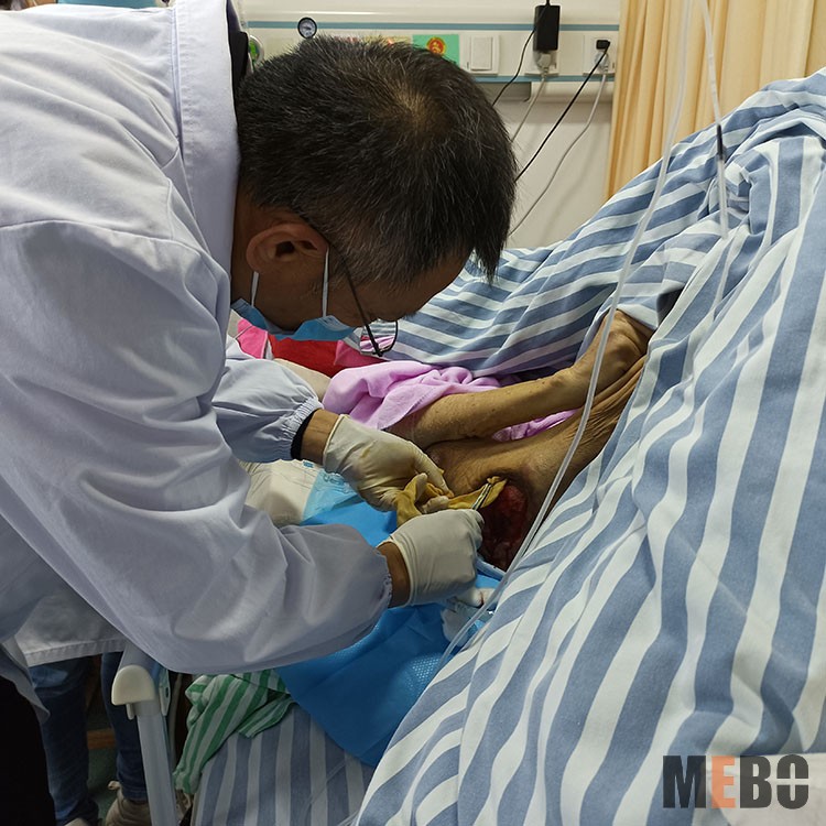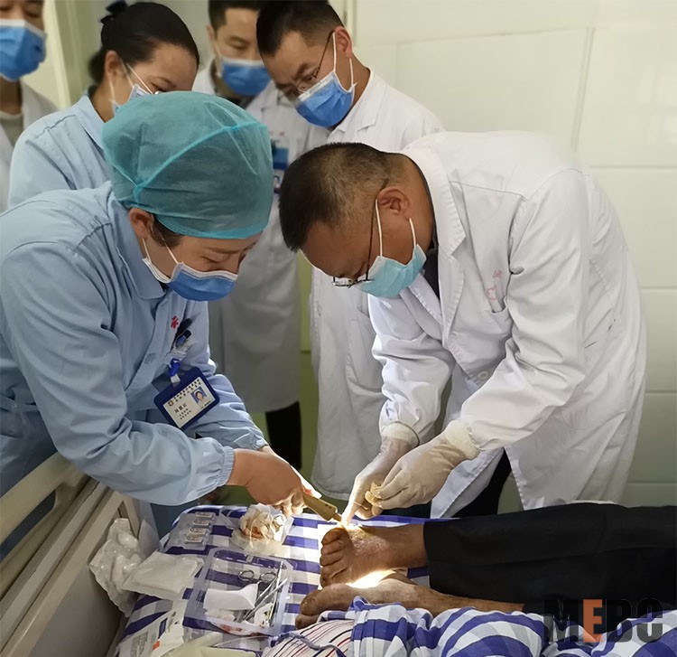 方教授在云和縣人民醫(yī)院,指導(dǎo)醫(yī)護(hù)人員為4級糖尿病足病人清創(chuàng),應(yīng)用再生醫(yī)療技術(shù)及濕潤燒傷膏換藥治療。