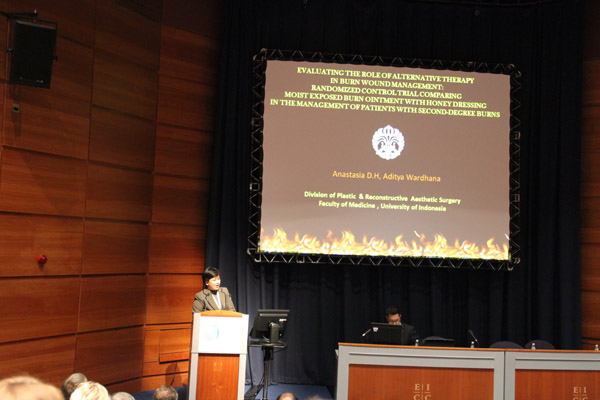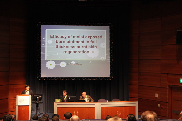在下午的自由發(fā)言中來自印度尼西亞大學(xué)的Anastasia Dessy 醫(yī)生以再生醫(yī)療技術(shù)與蜂蜜敷料在二度燒傷創(chuàng)面的對比進行了演講。她通過兩種方法在創(chuàng)面愈合時間,愈合質(zhì)量,以及愈合后疤痕情況等等幾個方面進行了全面對比研究。并得出結(jié)論兩組對比發(fā)現(xiàn)再生醫(yī)療技術(shù)組愈合時間明顯縮短同時患者痛苦小但創(chuàng)面愈合質(zhì)量高,同時指出,在他們醫(yī)院之前的研究中已有蜂蜜輔料對傳統(tǒng)SSD的對比試驗,結(jié)果顯示蜂蜜輔料組明顯優(yōu)于SSD組,因而其結(jié)論是:MEBO是在創(chuàng)面治療中的最佳選擇。在場與會專家非常認可并接受這種非常嚴謹?shù)目茖W(xué)對比試驗,對美寶的結(jié)果表示信服,同時通過上午的發(fā)言對再生醫(yī)療技術(shù)已經(jīng)有了一定的了解,因此提出更為深入的問題,如到底“美寶”是什么?(美寶的成分)以及其藥理,愈后疤痕治療評價等等問題。Anastasia醫(yī)生以她的理解一一給予解答。