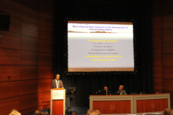 接下來,來自印度南部最大燒傷中心的主任Jayraman 醫(yī)生做了題為再生醫(yī)療技術(shù)在燒傷創(chuàng)面治療的經(jīng)驗的演講。演講過程中Jayaraman主任總結(jié)了此項技術(shù)的極大優(yōu)勢例如保持創(chuàng)面濕潤環(huán)境,抗炎抗感染以及痛苦小等等優(yōu)點。同時也展示再生醫(yī)療技術(shù)在印度臨床試驗過程收集的多個病例,通過生動鮮活的病例折服了在場所有觀眾。特別需要指出的是,Jayraman 主任對美寶的再生機理給予了詳細的解釋,從潛能再生細胞到干細胞,從再生環(huán)境到再生技術(shù),給與會專家又一全面的美寶科學(xué)的展示。在回答問題的環(huán)節(jié),Jayraman 主任與與會代表探討了燒傷愈后色素沉著的測量方法,美寶作用下干細胞再生的發(fā)生部位和過程等等,無論是提問還是回答,都相當精彩!