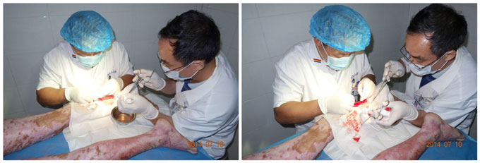 培訓(xùn)結(jié)束后,趙瑞慶教授針對運動醫(yī)學(xué)科等科室醫(yī)務(wù)人員提出的臨床問題,分別作了新鮮傷口正確使用創(chuàng)瘍貼、早期防治疤痕的耐心解答。趙瑞慶還在燒傷整形科,為鐵水燒傷的病人李某某做了殘余肉芽創(chuàng)面皮簇種植術(shù)的示范操作演示。煙臺山醫(yī)院本次培訓(xùn)手術(shù)演示,對該院開展多科室使用燒傷創(chuàng)瘍再生醫(yī)學(xué)與療法起到了很好的推動作用。