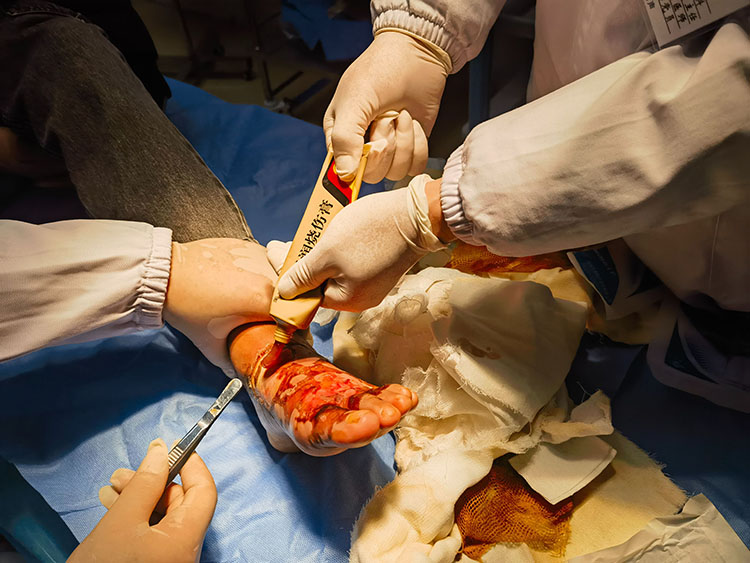2025年1月7日,《中國燒傷創(chuàng)瘍雜志》編委、燒傷創(chuàng)瘍再生醫(yī)療技術臨床專家張強應邀來到太湖縣人民醫(yī)院,對整形外科的一例糖尿病患者雙足燙傷創(chuàng)面進行會診,并進行再生醫(yī)療技術規(guī)范換藥示范,隨后與整形外科陶主任就燒燙傷、慢性創(chuàng)面再生醫(yī)療技術臨床應用進行深入交流!