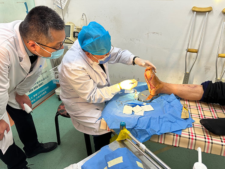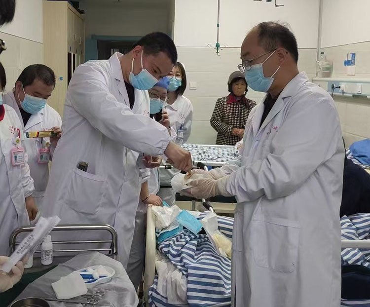 11月18日,應(yīng)贛州市中醫(yī)院創(chuàng)傷骨科廖主任的邀請(qǐng),《中國燒傷創(chuàng)瘍雜志》編委、燒傷創(chuàng)瘍?cè)偕t(yī)療技術(shù)臨床專家金黨軍和江西省總陳立新以及贛州地區(qū)負(fù)責(zé)人肖曉春,一起來到贛州市中醫(yī)院創(chuàng)傷骨科與廖副主任和壓瘡小組蔡護(hù)士長一起會(huì)診了三例糖尿病足患者、一例壓瘡患者,之后進(jìn)行了深入的學(xué)術(shù)交流,獲得了廖主任和蔡護(hù)士長的高度認(rèn)可和贊揚(yáng)。