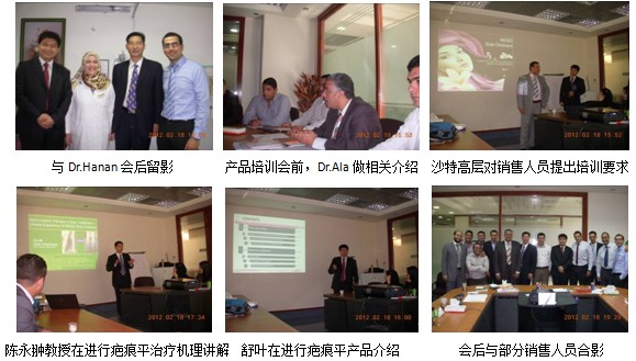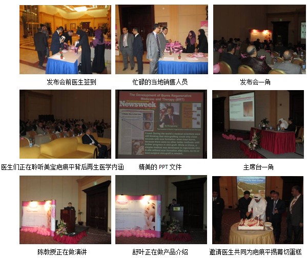 自2011年疤痕平軟膏在中東地區(qū)數(shù)個(gè)國(guó)家拿下CPP(Certificate of Pharmaceutical Product)藥品證書之后,美寶疤痕平已正式以藥品身份進(jìn)入醫(yī)院銷售渠道。在美寶國(guó)際市場(chǎng)集團(tuán)及其合作伙伴海灣Julphar藥廠積極的組織安排下,分別在沙特三大城市吉達(dá)、達(dá)曼、利雅得成功舉辦產(chǎn)品發(fā)布會(huì),共計(jì)有來自各市醫(yī)療機(jī)構(gòu)的440名臨床醫(yī)護(hù)人員參加了產(chǎn)品發(fā)布會(huì)。其間,訪問了當(dāng)?shù)刂攸c(diǎn)醫(yī)生13名,會(huì)診病例5名,直接培訓(xùn)當(dāng)?shù)匾痪€銷售人員25名。培訓(xùn)團(tuán)隊(duì)由來自中國(guó)燒傷創(chuàng)瘍科技中心臨床部主任、北京榮祥再生醫(yī)學(xué)研究所副所長(zhǎng)、北京中西醫(yī)結(jié)合學(xué)會(huì)燒傷專業(yè)委員會(huì)副主任委員、中國(guó)燒傷創(chuàng)瘍雜志社副社長(zhǎng)的陳永翀教授及美寶國(guó)際集團(tuán)產(chǎn)品部主管舒葉組成。培訓(xùn)內(nèi)容包括疤痕治療選擇、疤痕形成原因、疤痕平組成成分、再生醫(yī)學(xué)-抗疤痕機(jī)理、疤痕平臨床使用方法、美寶疤痕平聯(lián)合無創(chuàng)或有創(chuàng)方法治療各種疤痕的典型病例介紹等。具體情況報(bào)道如下: